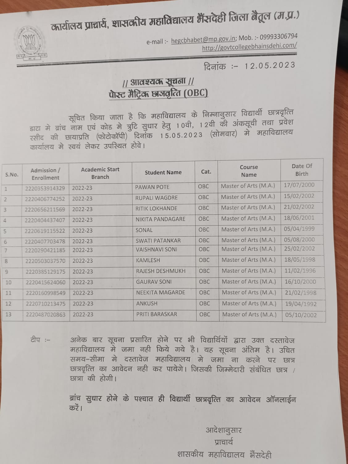 OBC scholarship error Notice for M.A. I Year (Political S.)